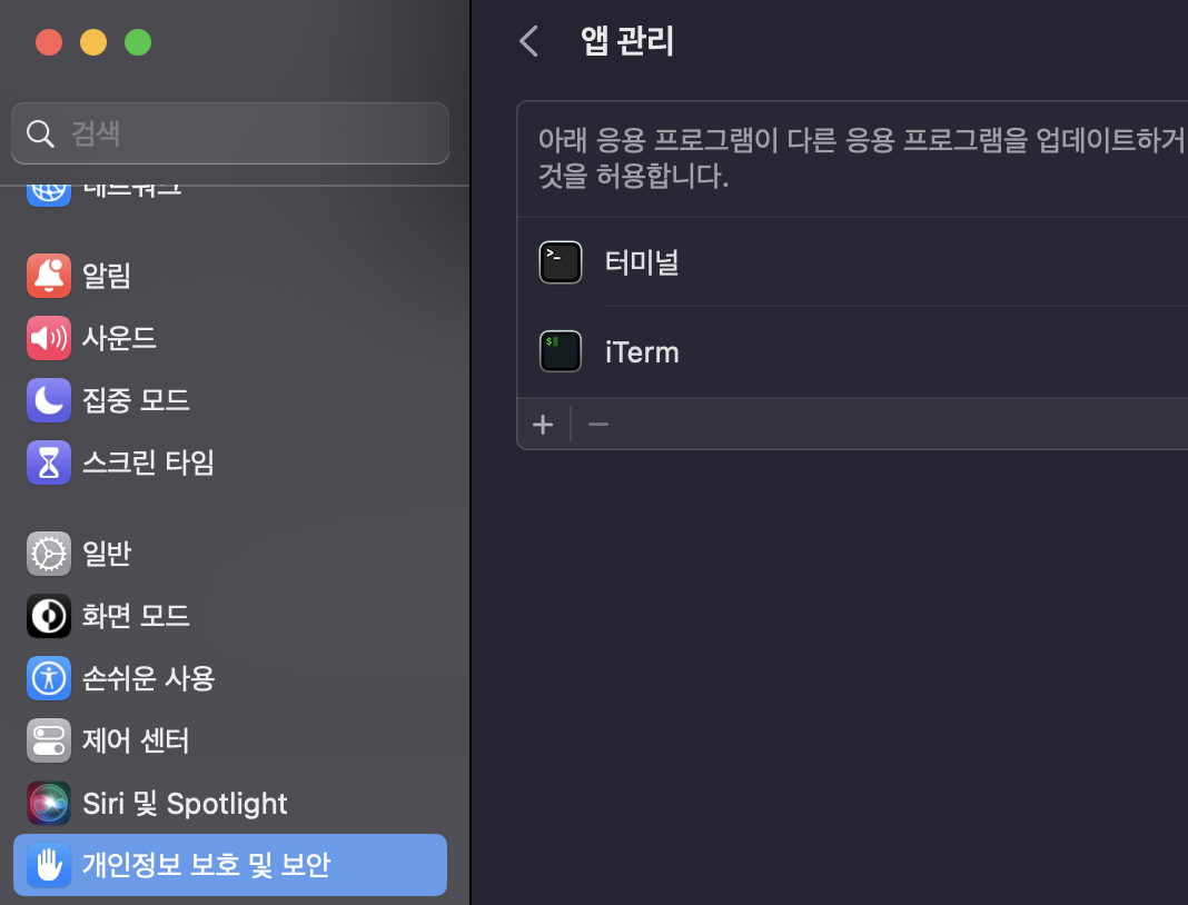 설정 -> 개인정보 보호 및 보안 -> 앱관리 -> 터미널을 추가해줘야합니다.