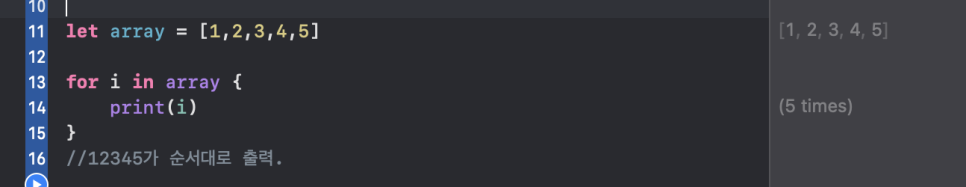 그 후 배열을 순회대상으로 사용하였고, 루프상수인 i의 값을 실행하면 1~5가 순서대로 출력되는 것을 확인가능합니다!