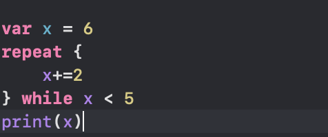여기서 의문점은 repeat while구문은 꼭 한번은 반복을 해야하는데 위에 구문에서는 x의 값이 6이기 때문에 조건에 해당하지 않습니다.